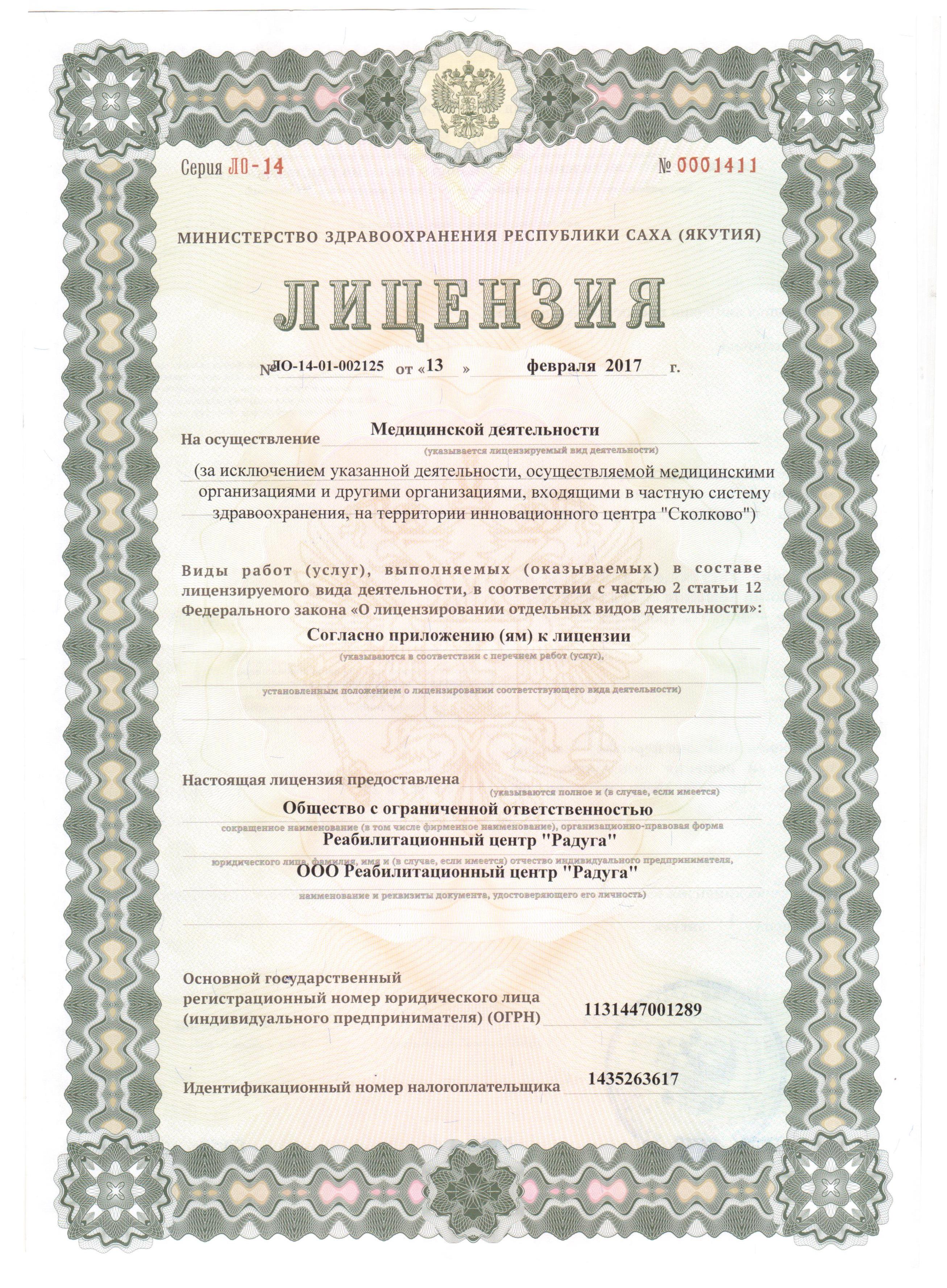 Лицензии Общество с ограниченной ответственностью Реабилитационный центр «Радуга» зарегистрировано 31.05.2013 года ОГРН 1131447001289 Учредители: Захарова Татьяна Васильевна, Пшенникова Галина Максимовна